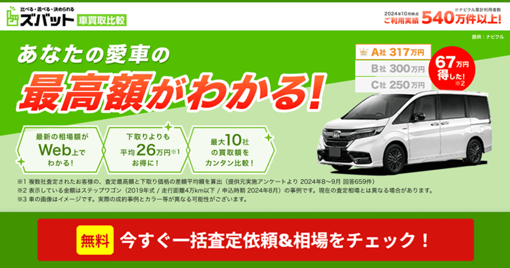 国内人気No.1の車査定サイト。最新の相場額がWeb上でわかります。最大10社の買取額を簡単に比較できます。